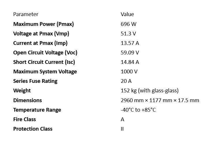 High - efficiency double - glass solar panels available - 696W, suitable for residential, commercial projects, farms, and warehouses. Technical Specifications Maximum Power (Pmax) 696W/ Voltage at Maximum Power (Vmp) 51.3V/ Current at Maximum Power (Imp) 13.57A/ Open Circuit Voltage (Voc) 59.09V/ Short Circuit Current (Isc) 14.84A/ Maximum System Voltage 1000V/ Price USD43 per panel