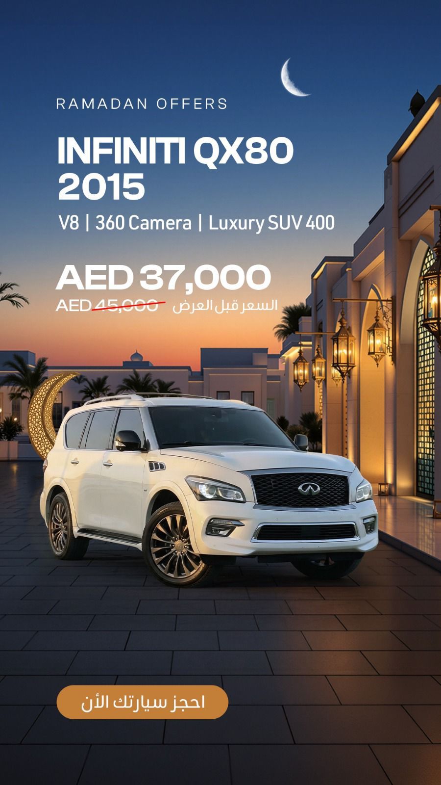 انفينيتي كيو اكس 80 موديل 2015، السعر المطلوب 45,000 درهم قبل العرض، وبعد العرض 37,000 درهم (عروض رمضان). مواصفات أمريكية، فل أوبشن، رقم 1 - جلد، فتحة سقف - محرك 400 V8 كبير - 5 كاميرات 360 - رادار، تحذير الخروج عن المسار - مراقبة النقاط العمياء - 3 شاشات - كراسي كهربائية - تبريد وتسخين المقاعد - تشغيل عن بعد. نظيف جداً من الداخل والخارج، جاهز للاستخدام. للتواصل هاتفياً.