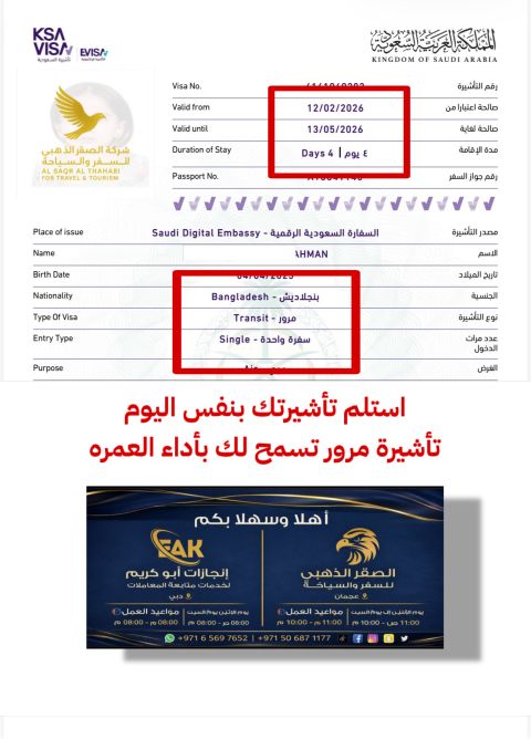 استلم تأشيرة مرور للسعودية بنفس اليوم فقط بصورة الجواز وصورة شخصية تسمح لك بأداء العمره من شركة الصقر الذهبي للسفر والسياحة في إمارة عجمان النخيل 2 وأسعار خاصة للشركات والمناديب