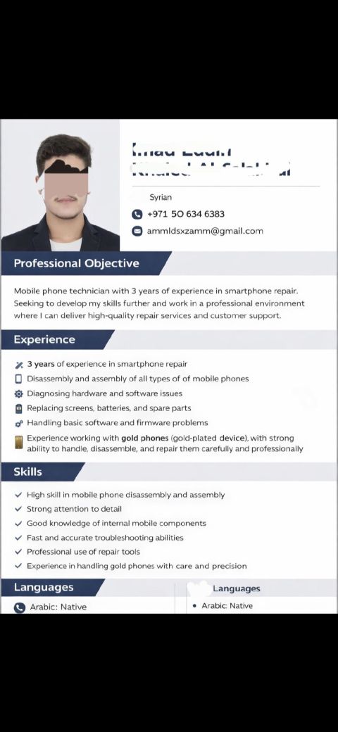 فني صيانة هواتف محمولة بخبرة تزيد عن 4 سنوات في المجال. امتلك مهارة عالية في تشخيص الأعطال وإصلاحها، مع خبرة عملية في التعامل مع الأيسيات ومشاكل المذربورد الدقيقة. قادر على العمل تحت الضغط وتقديم حلول فعالة وسريعة، وأسعى دائما لتطوير مهاراتي ومواكبة أحدث تقنيات الصيانة