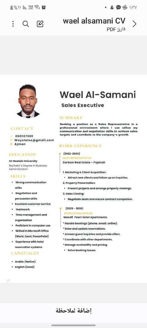 يطلب عمل مبيعات وتسويق في إمارة الشارقة الإمارات