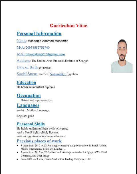 I am looking for a job opportunity as a driver in the UAE. I hold a light vehicle manual driving license. Alternatively, I am seeking employment in sales within the UAE. I have strong experience in retail and customer service