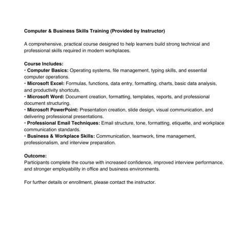 I am Now Offering a Complete Computer & Business Skills Course Boost your career with my practical training in Computer Basics Excel Word PowerPoint Professional Email Techniques Business & Workplace Skills This course is designed to improve your interview performance and help you stand out confidently. Reach out to me for more details