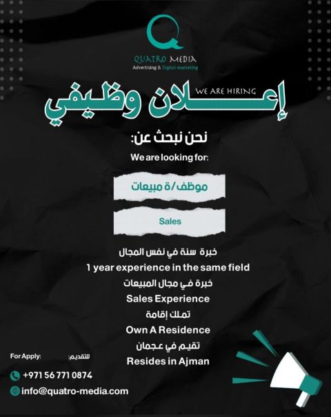 مطلوب موظفة مبيعات للعمل في شركة دعاية واعلان في عجمان الجرف بشرط تواجد إقامة سارية وخبرة سنة في الامارات على الأقل + انجليزي جيد جدا، دوام وراتب ثابت + عمولة، الرجاء إرسال السيرة الذاتية