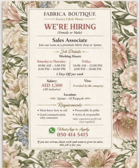 Sales Associate Required Fabric shop in Ajman is looking for a sales associate (male or female) with sales experience and good customer service skills. Visa available or family visa