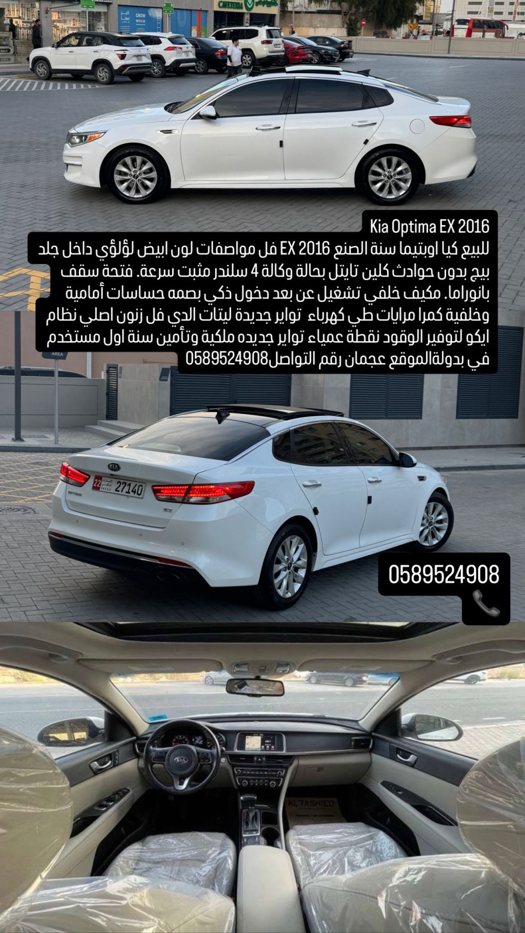 كيا أوبتيما EX 2016 للبيع. كيا أوبتيما، سنة الصنع 2016، فل مواصفات EX. لون أبيض لؤلؤي، داخل جلد بيج، بدون حوادث، كلين تايتل، بحالة وكالة. 4 سلندر، مثبت سرعة، فتحة سقف بانوراما، مكيف خلفي، تشغيل عن بعد، دخول ذكي، بصمة، حساسات أمامية وخلفية، كاميرا خلفية، مرايات طي كهربائي، تواير جديدة، ليتات LED كاملة، زينون أصلي، نظام ECO لتوفير الوقود، نظام مراقبة النقطة العمياء، تواير جديدة، ملكية وتأمين سنة. أول مستخدم في الدولة. الموقع: عجمان.