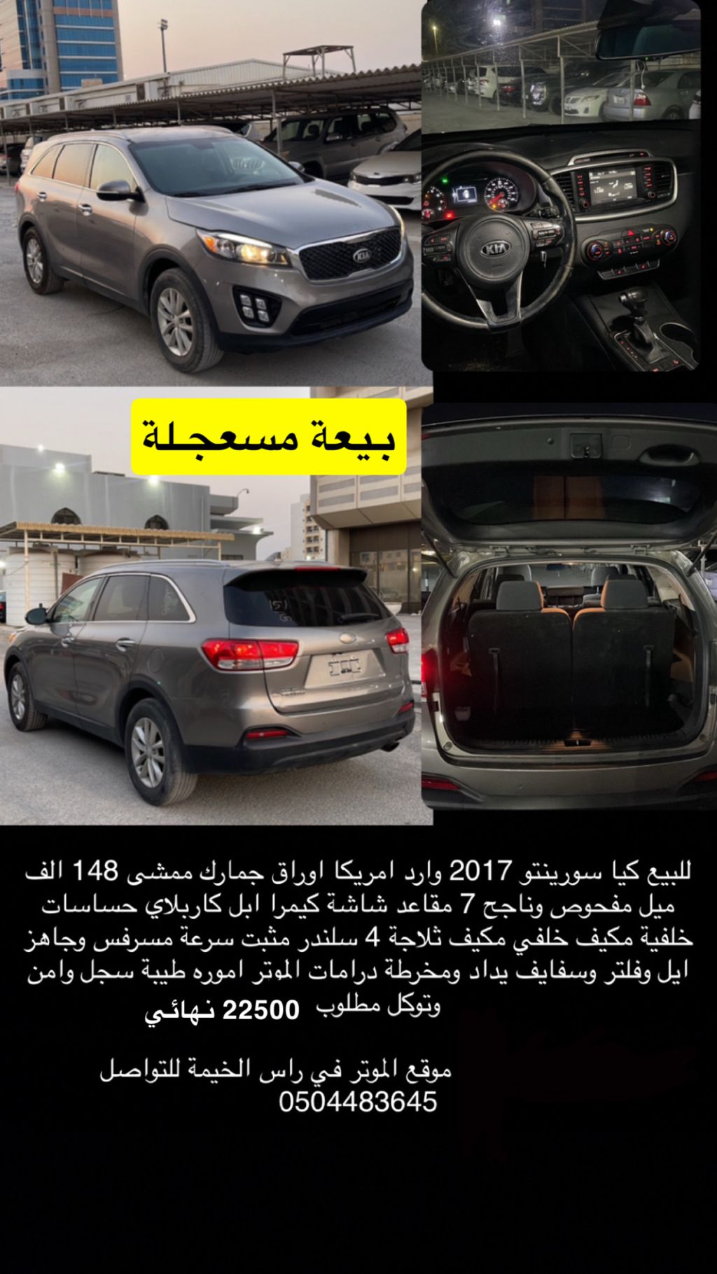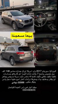Kia Sorento 2017 very clean, mileage 148,000 km, inspected and passed, screen camera sensors, 7 seats, cold AC, final price.