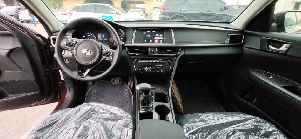 Kia Optima 2018, American import, 5 XXGT 4L37JG210971, Specification number 2, 2400 cc engine, mileage 118,000 miles, steering control and cruise control, large screen with Android Auto and Apple CarPlay, rear camera, rear sensors, drive mode sport and eco, electric trunk, sunroof. Required down payment: 6,000 AED, monthly installment: 2,500 AED for one year, including full service, one-year ownership, insurance, administrative fees, license, ID, and check.
