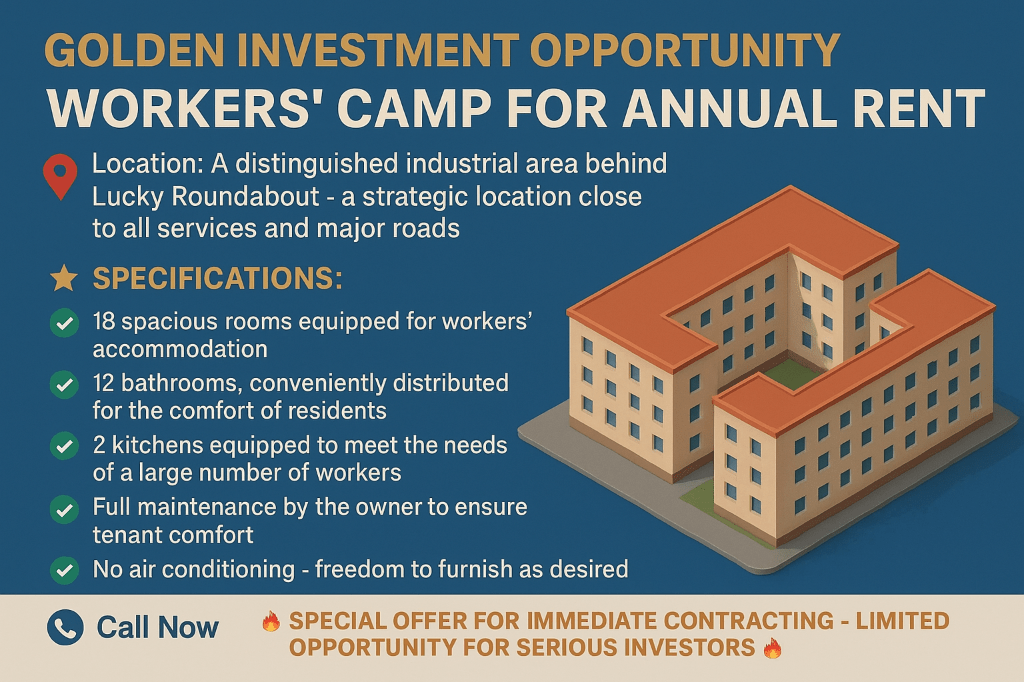 فرصة استثمارية ذهبية - كامب عمال للإيجار السنوي الموقع منطقة صناعية مميزة خلف دوار لا كي - موقع استراتيجي قريب من جميع الخدمات والطرق الرئيسية. المواصفات 35 غرفة واسعة ومهيأة لسكن العمال 18 حمام موزعة بشكل عملي لراحة الساكنين 2 مطبخ مجهزة لتلبية احتياجات عدد كبير من العمال صيانة كاملة على المالك لضمان راحة المستأجر بدون مكيفات - حرية تجهيز حسب رغبة المستثمر عرض خاص عند التعاقد الفوري - فرصة محدودة
