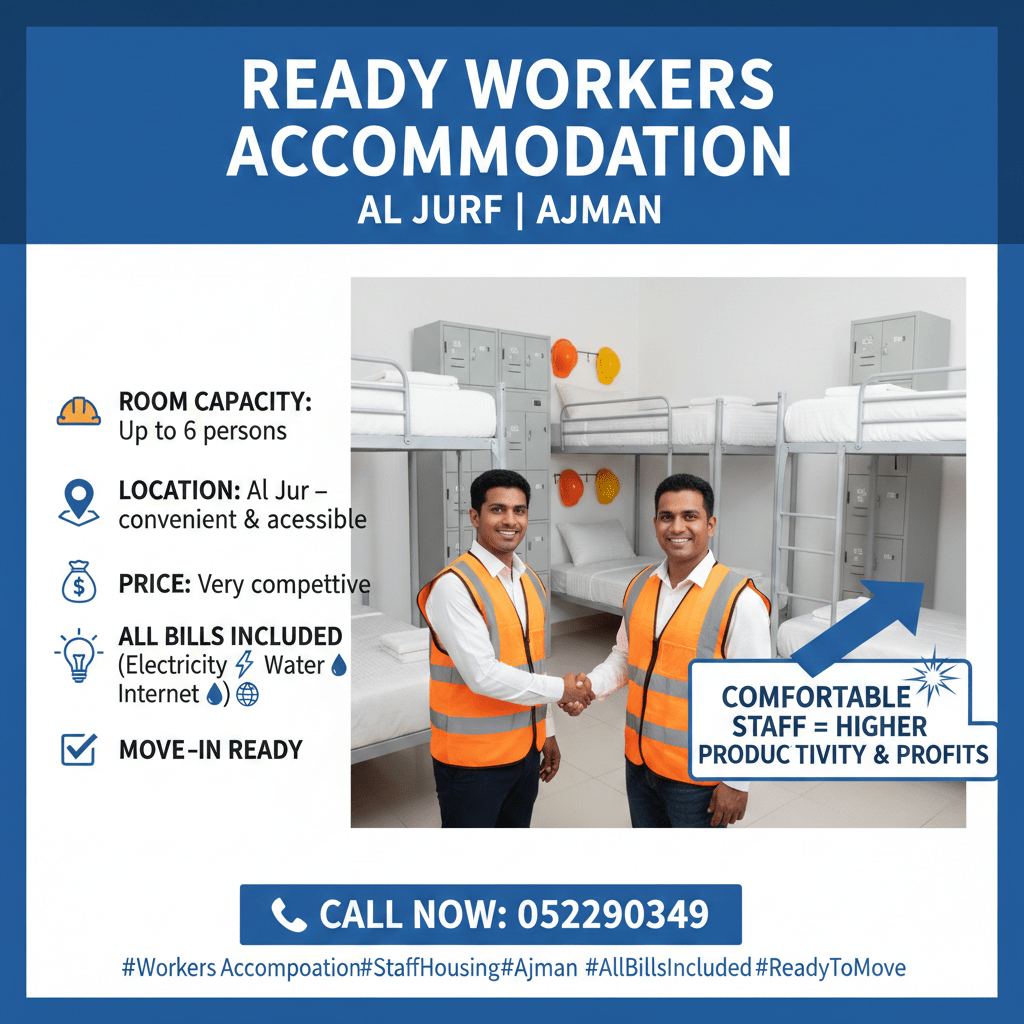 سكن عمال جاهز للاستخدام الفوري - الجرف عجمان سعة الغرفة حتى 6 أشخاص الموقع الجرف - موقع عملي وسهل الوصول السعر مميز جدا شامل جميع الفواتير (كهرباء مياه انترنت) جاهز للسكن فورا راحة موظفيك زيادة الانتاج والأرباح تواصل الآن