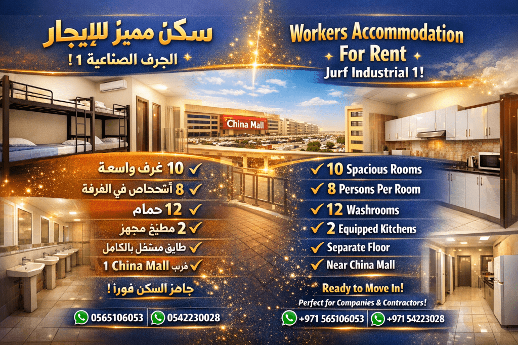 سكن عمال مميز للإيجار - الجرف الصناعية 1 حل مثالي للشركات والمؤسسات الباحثة عن سكن منظم عملي وبموقع استراتيجي مواصفات السكن 10 غرف واسعة سعة 8 أشخاص لكل غرفة 12 حمام 2 مطبخ مجهزين طابق مستقل بالكامل موقع مميز في الجرف الصناعية 1 على مسافة مشي من China Mall جاهز للسكن فورا مناسب للشركات والمقاولين للتواصل عبر