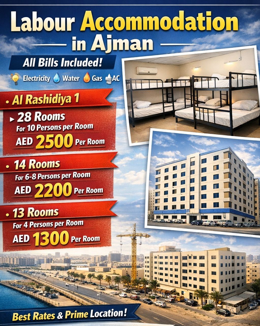 سكن عمال مميز في عجمان الراشدية 1 شامل جميع الفواتير (كهرباء مياه غاز تكييف) موقع استراتيجي وخدمات متكاملة تناسب الشركات والمقاولين تفاصيل الغرف والأسعار 28 غرفة - 10 عمال في الغرفة 2500 درهم للغرفة شهريا - 14 غرفة - 6 الى 8 عمال في الغرفة 2200 درهم للغرفة شهريا - 13 غرفة - 4 عمال في الغرفة 1300 درهم للغرفة شهريا مبنى نظيف فرش جديد تهوية ممتازة سهولة دخول وخروج للباصات أفضل الأسعار في موقع مميز للتواصل