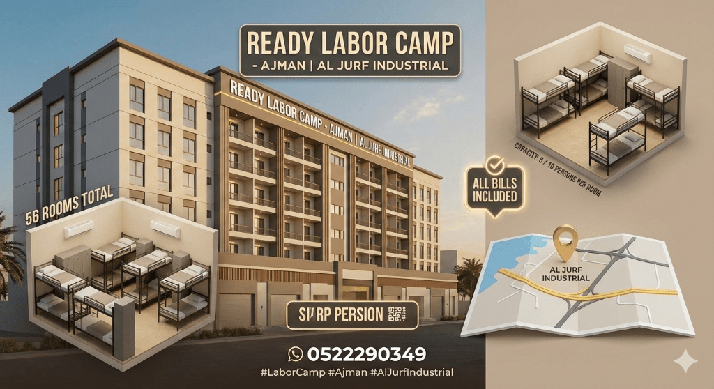 سكن عمال جاهز للاستخدام الفوري - عجمان الجرف الصناعية حل مثالي لراحة موظفيك واستقرار أعمالك تفاصيل السكن عدد الغرف 56 غرفة سعة الغرفة 8 أشخاص/ 10 أشخاص شامل جميع الفواتير مجهز وجاهز للسكن فورا المميزات موقع مميز في الجرف الصناعية سهل الوصول وقريب من الخدمات قريب من الطرق الرئيسية بيئة مريحة وآمنة للعمال لا تتردد واحجز الآن