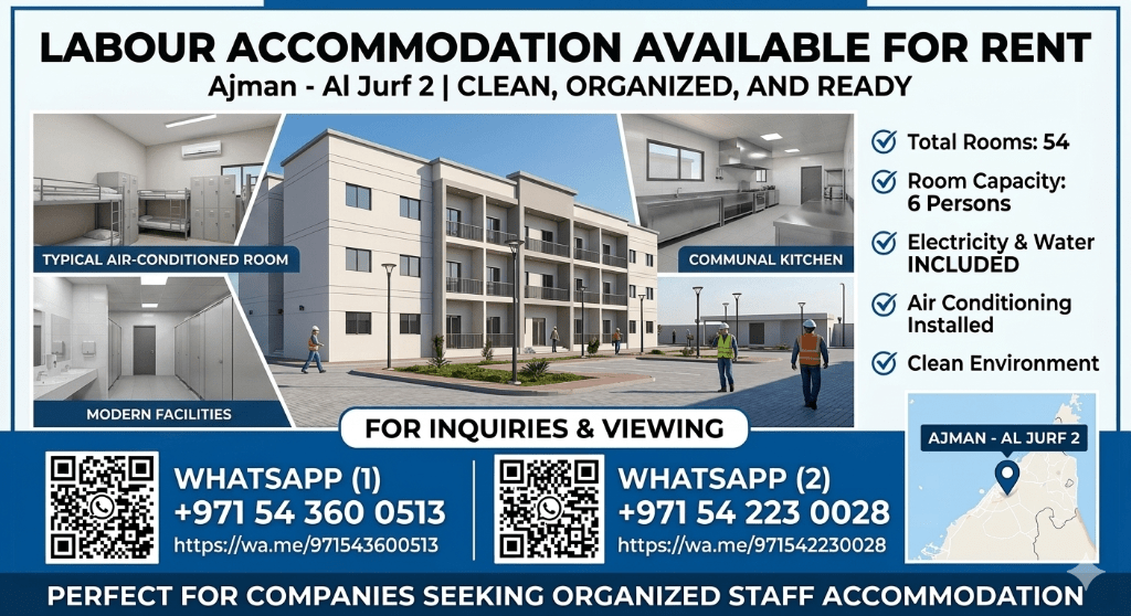 Labour Accommodation Available for rent - Ajman Al Jerf 2 A great opportunity for companies looking for clean and well - maintained labour accommodation in Ajman. Property Details Total Rooms 54 Rooms Room Capacity 6 Persons per Room Electricity & Water Included Air Conditioning Installed Clean and comfortable environment for workers Location Ajman - Al Jerf 2 Perfect for companies seeking