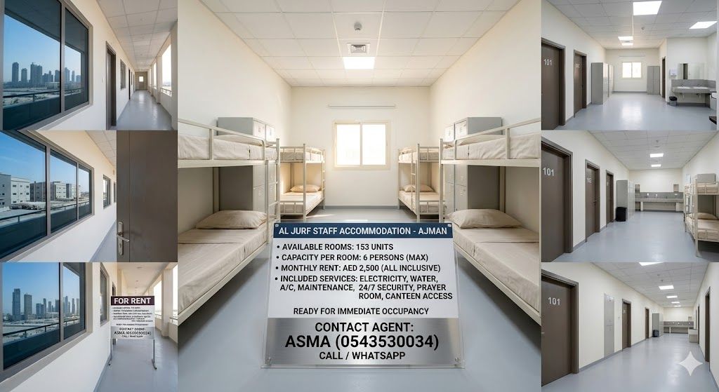 فرصة سكنية كبرى للإيجار في الجرف - عجمان نقدم لكم مجمع سكني متكامل (سكن عمال / موظفين) بمواصفات قياسية وموقع استراتيجي بالقرب من كافة الخدمات والمنشاءات الصناعية. الموقع عجمان - منطقة الجرف. تفاصيل العرض عدد الغرف متوفر 153 غرفة (جاهزة للاستيعاب الفوري) الطاقة الاستيعابية الغرفة الواحدة تتسع ل 6 أشخاص بار يحية. الحالة نظافة تامة وصيانة دورية. السعر والمميزات الإيجار 2500 درهم شهريا للغرفة. المفاجأة