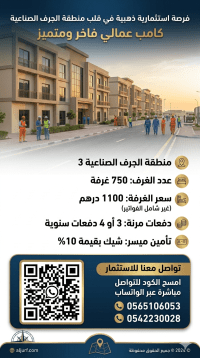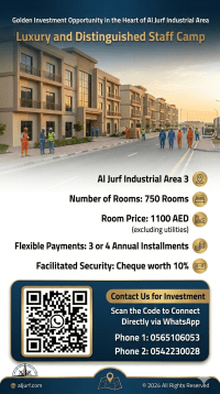 فرصة استثمارية ذهبية في قلب الجرف الصناعية - عجمان كامب عمالي فاخر ومتميز للإيجار في موقع استراتيجي داخل منطقة الجرف الصناعية 3، مصمم خصيصا لتلبية احتياجات الشركات والمقاولين. الموقع الجرف الصناعية 3 - عجمان عدد الغرف 750 غرفة سعر الغرفة 1100 درهم شهريا (غير شامل الفواتير) طريقة الدفع امكانية الدفع على 3 أو 4 دفعات سنوية التأمين شيك تأمين بقيمة 10% مناسب لسكن العمال والشركات موقع استراتيجي قريب