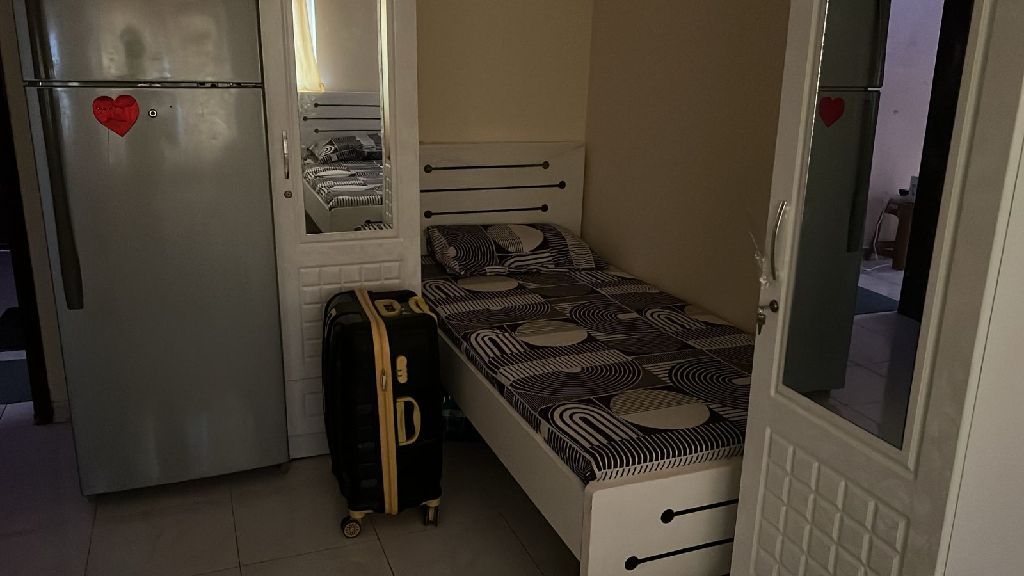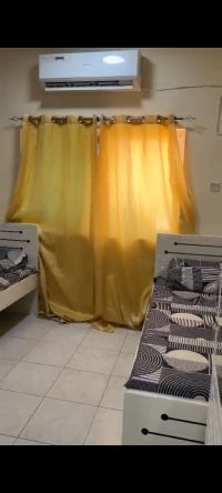 Available single beds in a four - sharing room in Al Nakheel, Ajman Corniche area, near Al Diwan Towers and Bahi Ajman Hotel. The bed price is only AED650. The accommodation is clean, and a fridge is available inside the room
