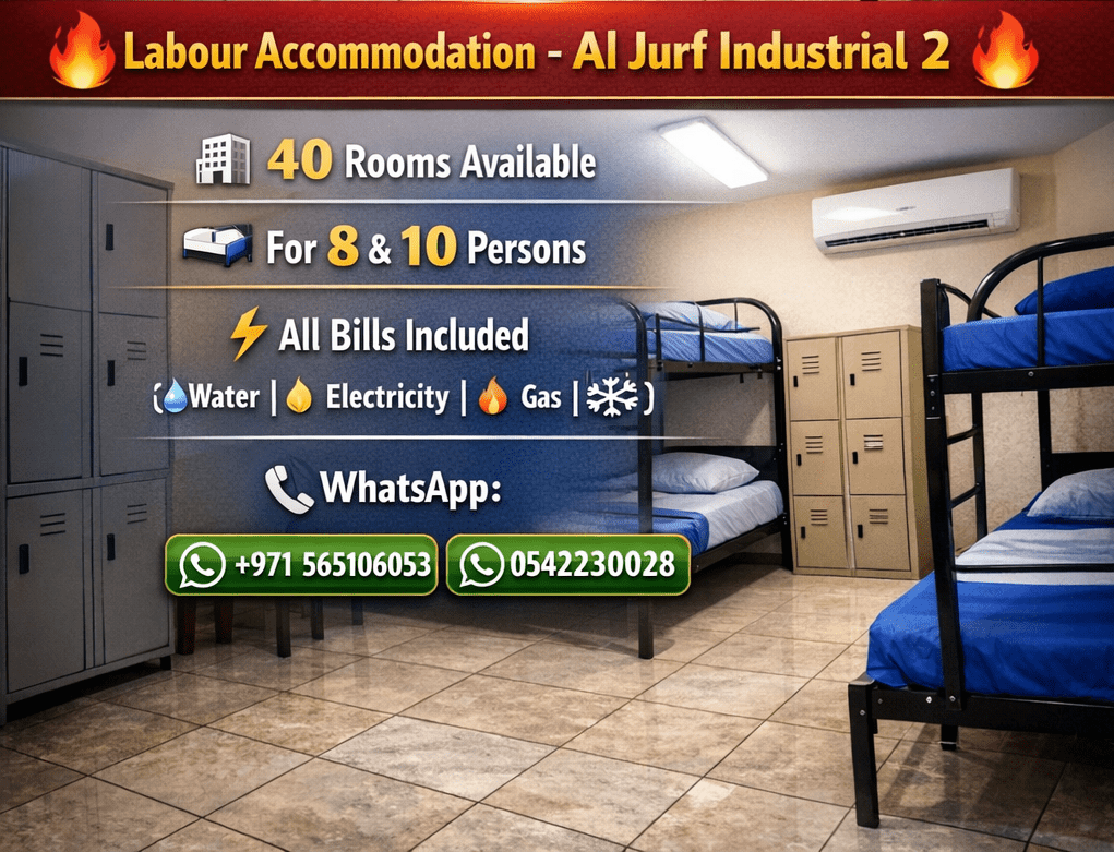 Workers Accommodation for rent - Al Jerf Industrial 1 & 3 Rashidiya A golden opportunity for companies to provide fully equipped housing for their workers Accommodation Features fully furnished rooms including All bills included (electricity, water, gas) Central AC Room capacity options 4 persons/ 6 persons/ 8 persons/ 10 persons Prime locations Al Jerf Industrial 1 & 3, and Rashidiya