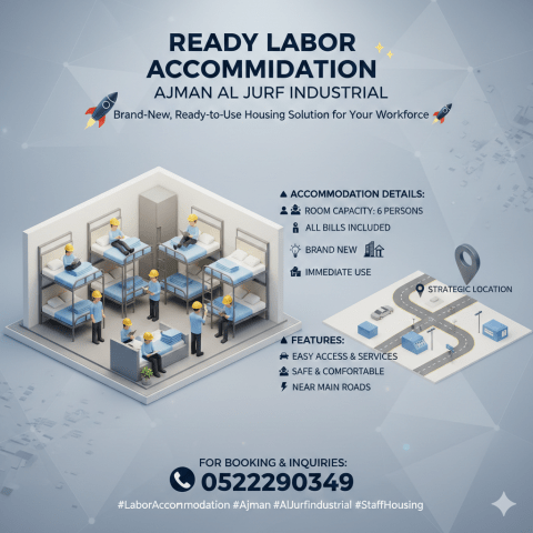 Ready Labor Accommodation - Ajman Al Jerf Industrial A brand - new, ready - to - use housing solution for your workforce Accommodation Details Room capacity 6 persons All bills included Brand new accommodation Ready for immediate use Features Strategic location in Al Jerf Industrial easy access & close to services Safe and comfortable environment Near main roads For booking & inquiries