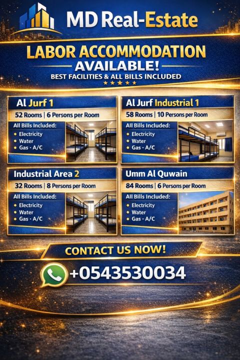 For rent - Labor Camp Al Jerf Industrial Area 2 - Ajman Property Details Total Rooms 87 rooms Room Capacity 6 persons per room Price AED1400 excluding utilities Payment 2 cheques Lease Type From investor to company or another investor Ideal for large companies Ready for immediate occupancy Contact