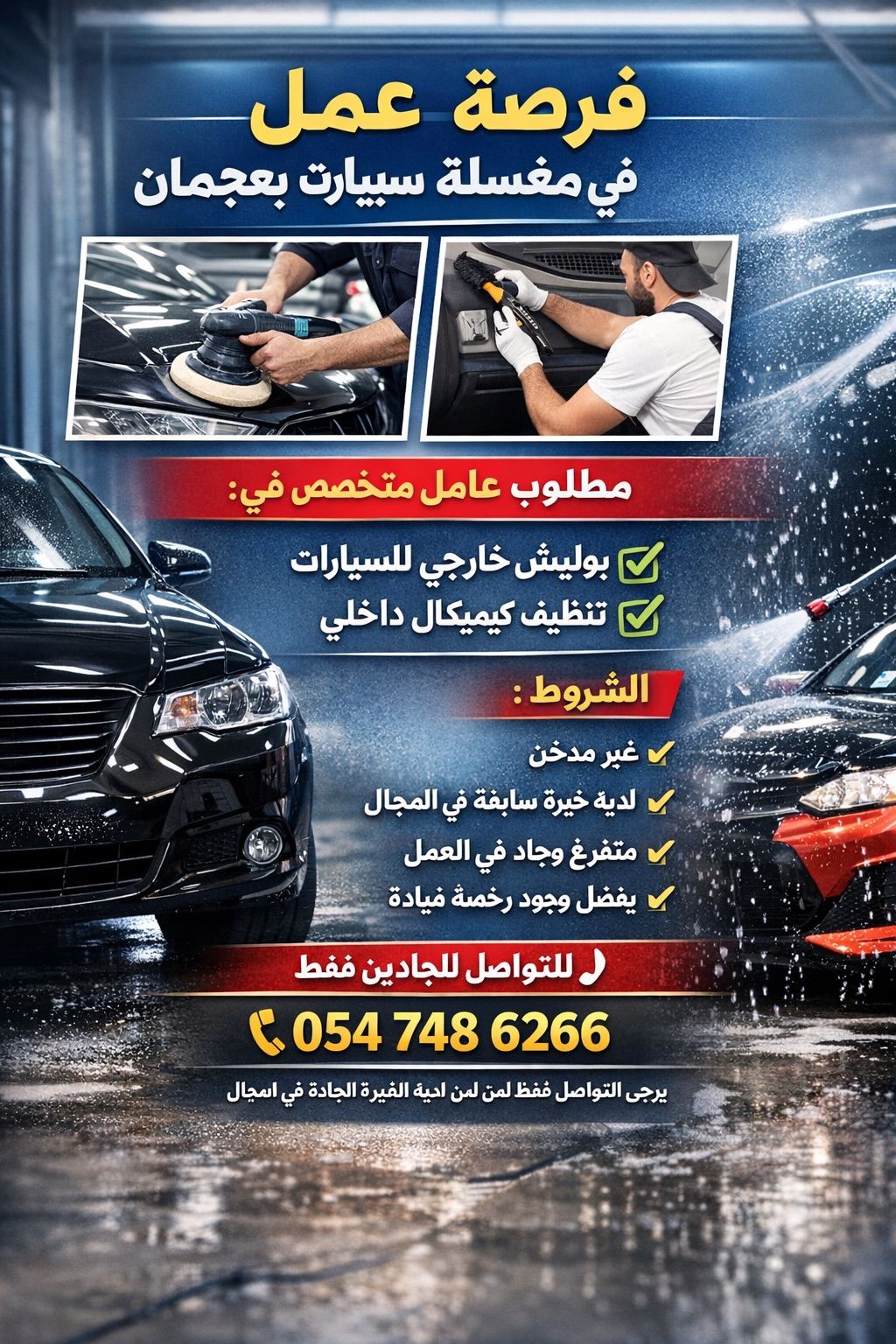 Job Opportunity at a Car Wash in Ajman We are looking for a specialist in Exterior Car Polishing Interior Chemical Cleaning Requirements Non - smoker - Previous experience in the field - Available full time and committed to work - A driver's license is preferred Ajman - alrawda 3