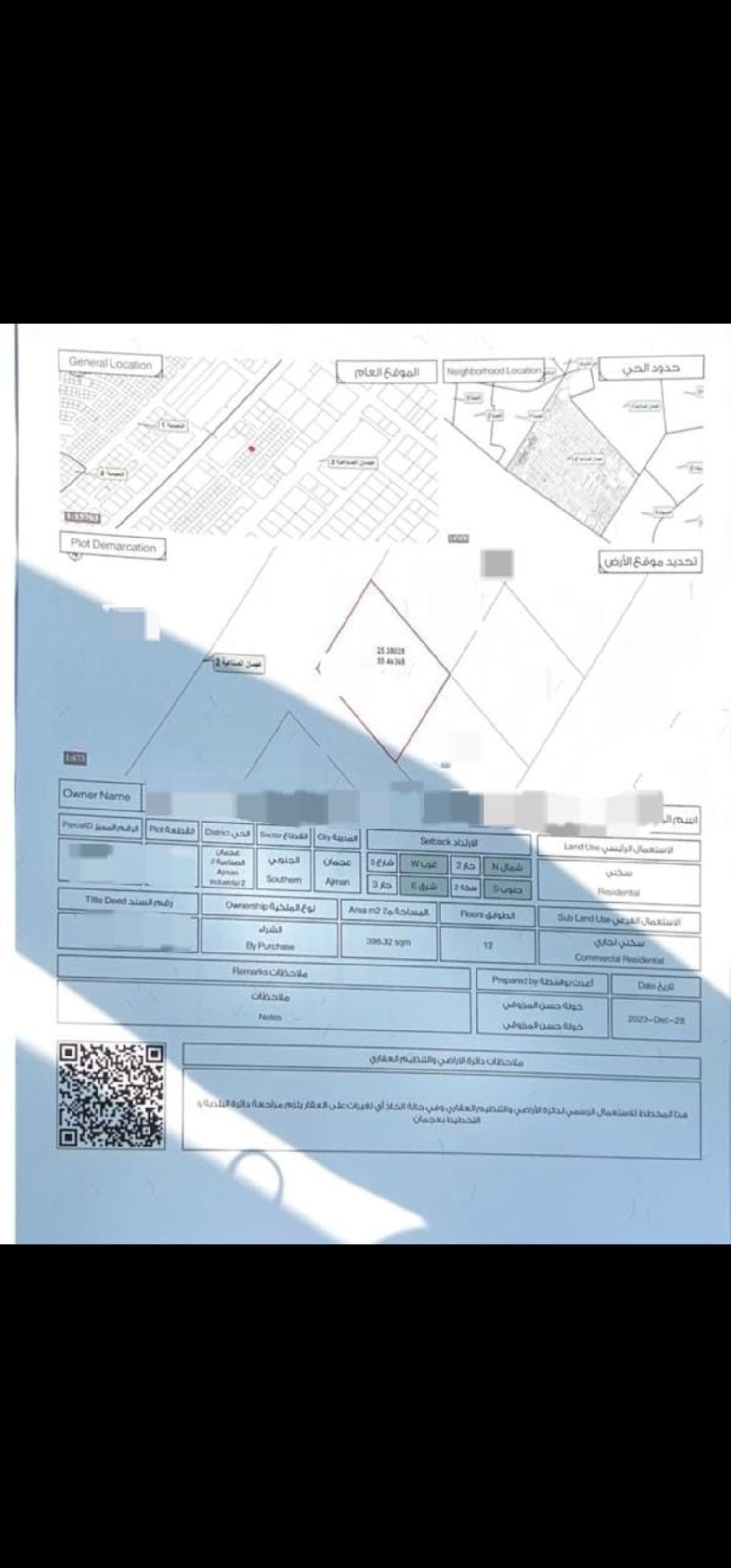 للبيع من المالك مباشر أرض في عجمان الصناعية 2 سكني تجاري أرضي + 12 زاوية شارع وسكة مساحة 398 متر 4284 قدم موقع ممتاز مطلوب مليون و600 ألف