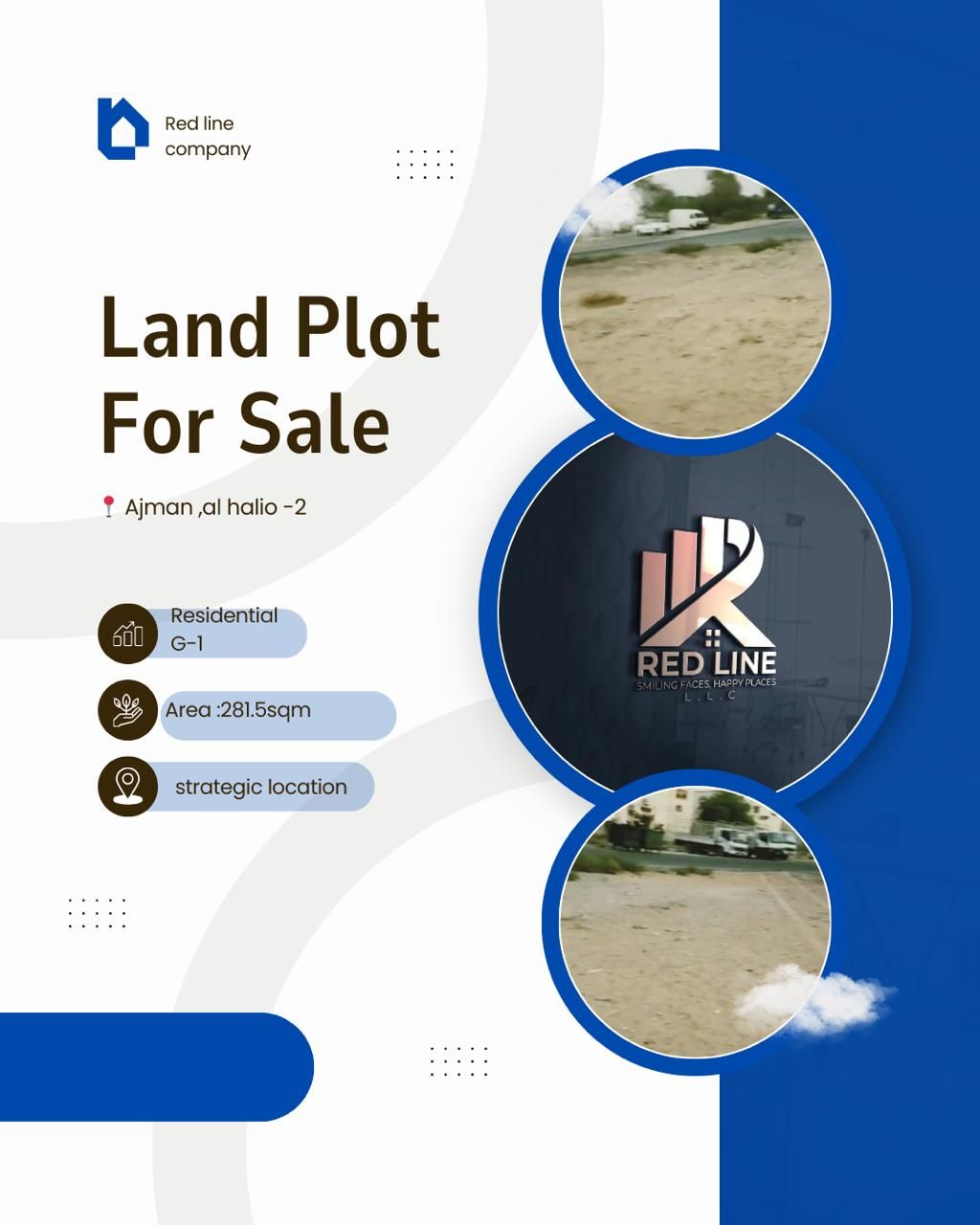 للبيع. أرض عجمان الحليو 2 سكني G 1 المساحة 281.5م زاوية وشارع رئيسي السعر 650 ألف (مقدمة من شركة الخط الأحمر للعقارات. Red line real estate)