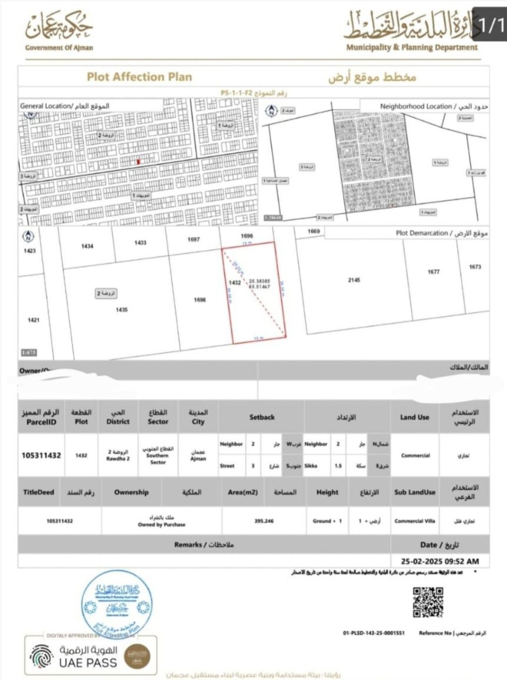 للبيع أرض سكني تجاري فلل على شارع التلة الروضة 2 عجمان مساحة 4250 قدم مربع شارع وسكة مطلوب 1.3 مليون