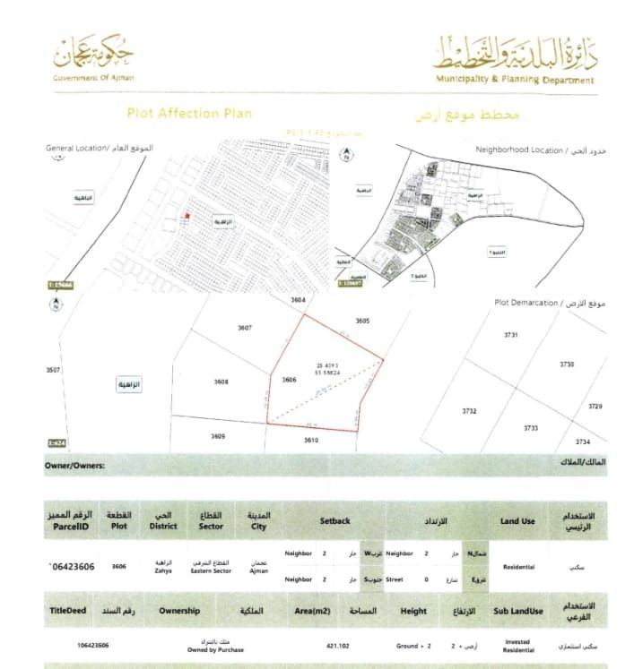 للبيع قطعة أرض في الزاهية عجمان مساحة 421م - 4500 قدم تصريح بناء بناية بدون محلات أرضي وطابقين تملك حر - يوجد رسوم تسجيل قريب شارع الشيخ محمد بن زايد مطلوب 920 ترجمة