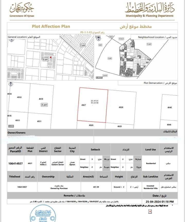 للبيع - قطعة أرض سكنية في الحليو 2، عجمان زاوية على شارعين قار - موقع مميز وسهل الوصول المساحة 452 متر مربع (4865 قدم مربع) تصريح بناء فلل أرضي + طابقين تملك حر غير شامل رسوم التسجيل السعر النهائي 950000 درهم فرصة مثالية لبناء فيلا سكنية في منطقة راقية وهادئة، قريبة من الخدمات والمرافق الرئيسية