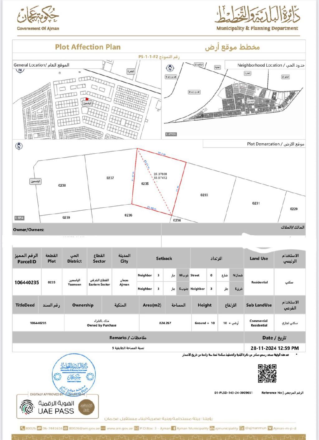 قطعة أرض سكني تجاري في عجمان الياسمين قرية الأميره G 10 مساحة 825 متر - 8880 قدم تملك حر للتواصل