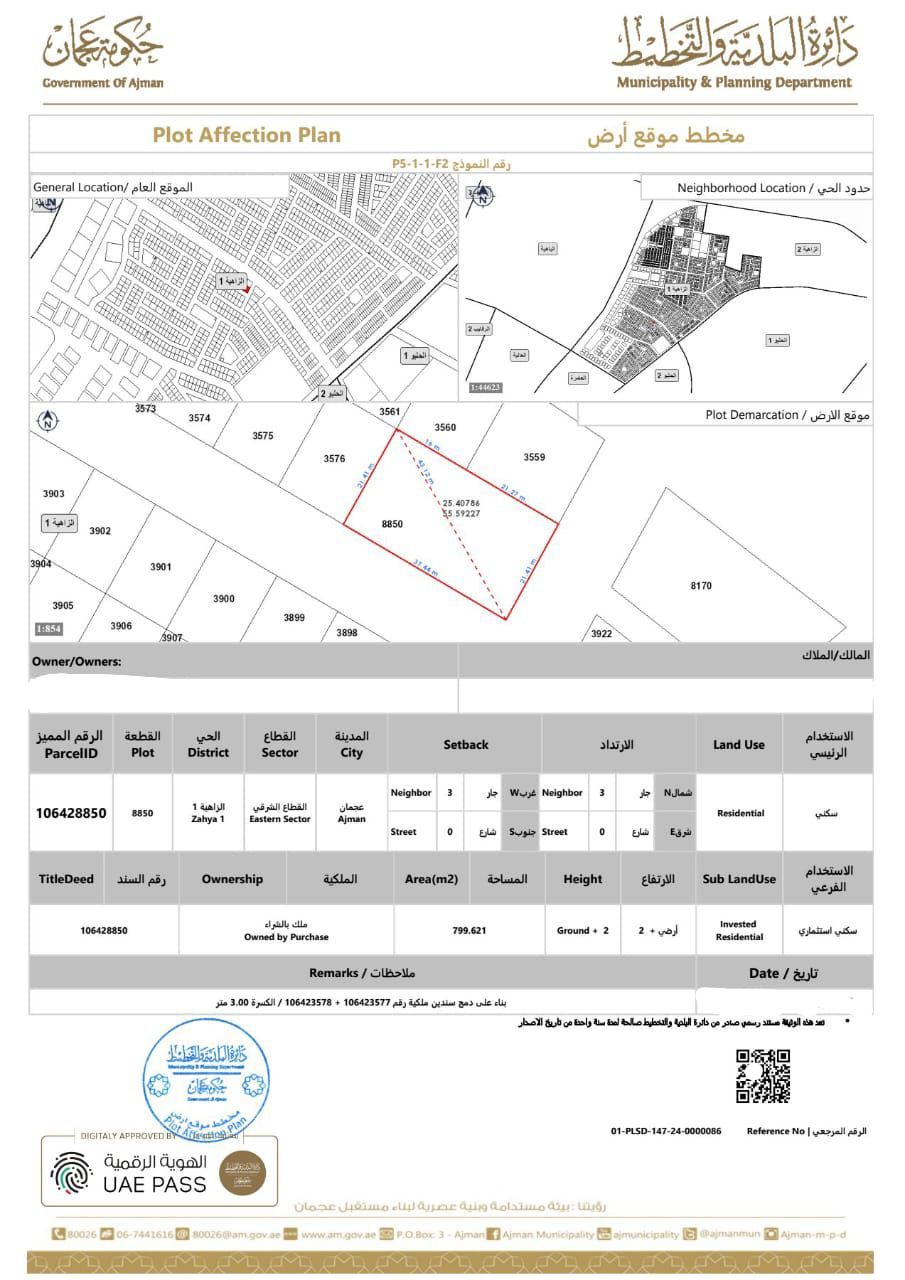 للبيع في الزاهية في عجمان قطعة أرض زاوية شارعين ثاني قطعة من شارع الزاهية الرئيسي تصريح بناء بناية بدون محلات G 2 تملك حر مساحة 800م - 8611 قدم للتواصل