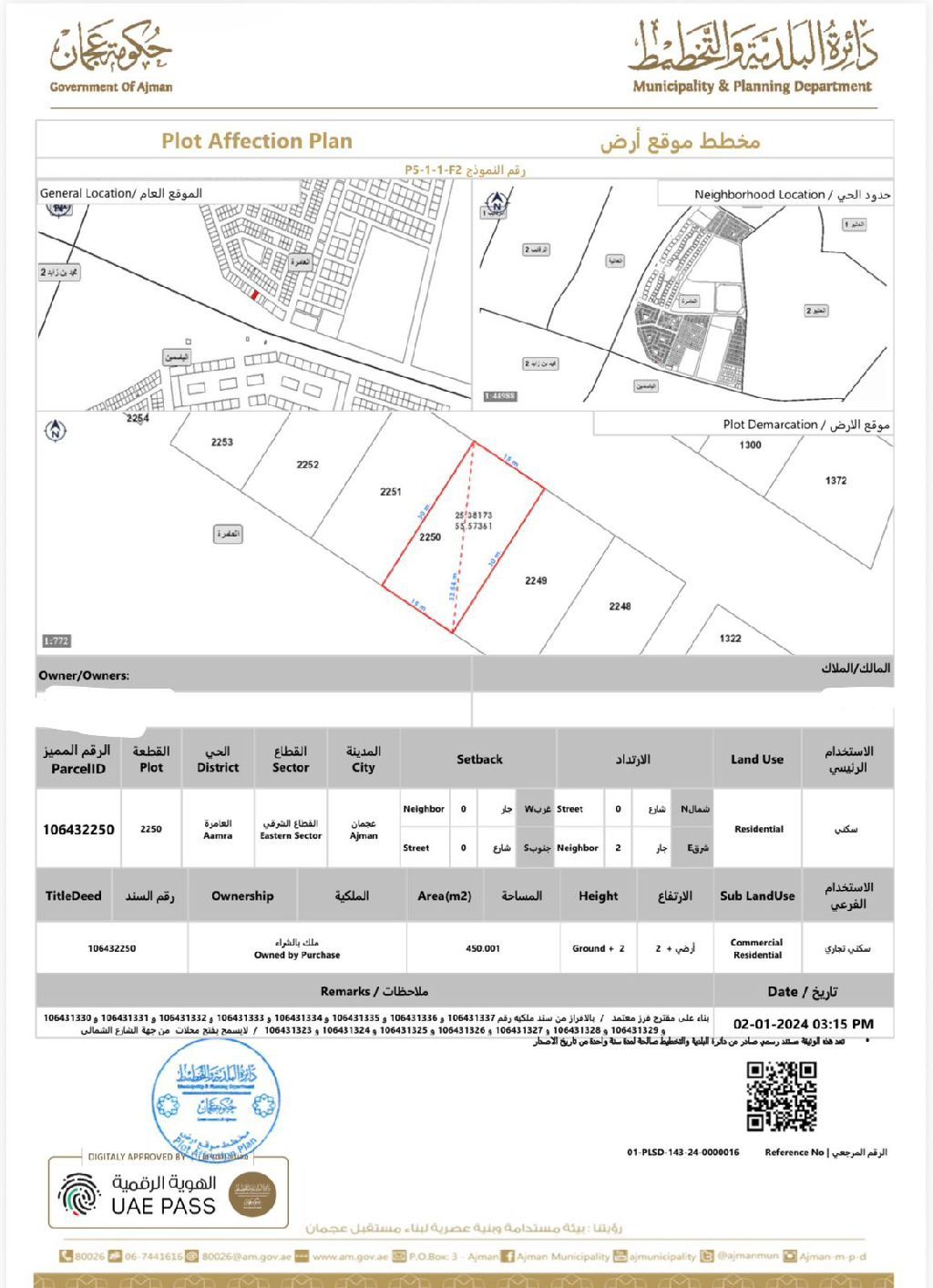 للبيع في العامرة في عجمان قطعة أرض سكني تجاري مساحة 450م - 4843 قدم تصريح G 2 شارع قار ظهر وبطن
