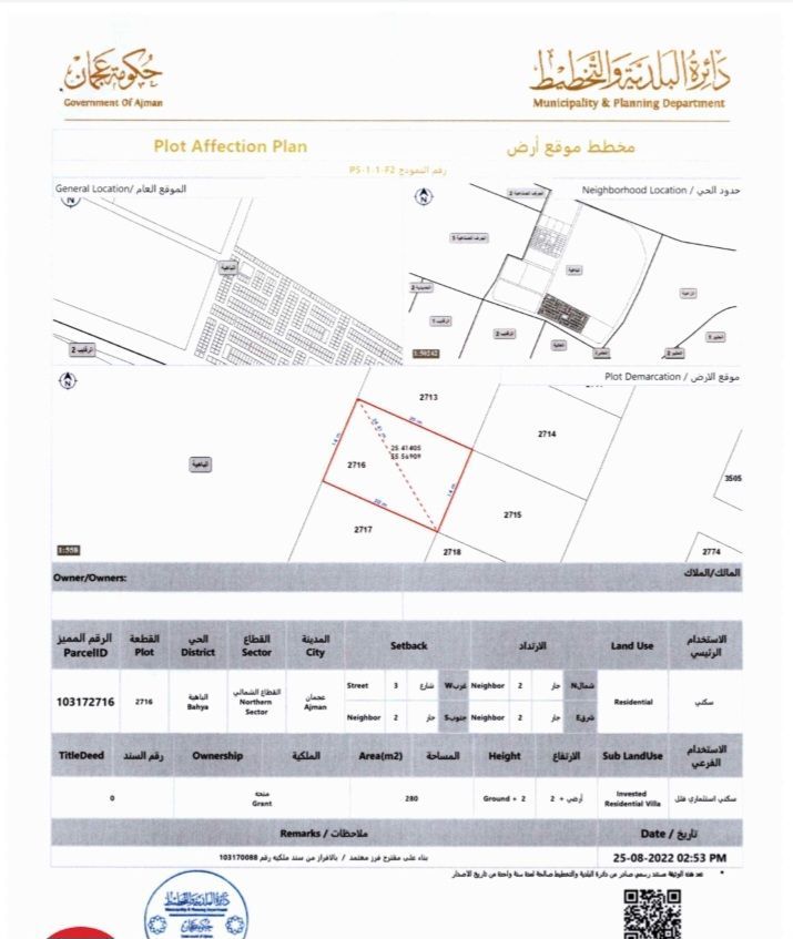 للبيع - أرض سكنية في الباهية، عجمان فرصة مميزة لبناء منزلك أرض سكنية بمساحة 280م (3014 قدم) ارتداد 25 متر موقع ممتاز في الباهية، قريبة من المعارض والخدمات