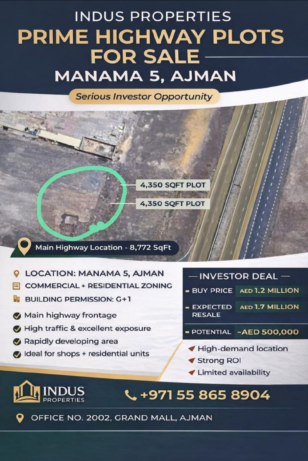 Prime Highway plot for sale. Manama 5 Ajman. 4350 (SqFt) plot + 4350 (SqFt) plot. main haigh way location (8722 SqFt) building permission G 1. buy price 1.2 Million. فرصه كبيرة للاستثمار في عجمان منطقة المنامة. قطعة أرض علي الطريق الرئيسي بمنطقة خدمات حيويه. تصريح أرضي وطابق تصلح تجاري وسكني. سعر البيع مليون ومائتي ألف درهم