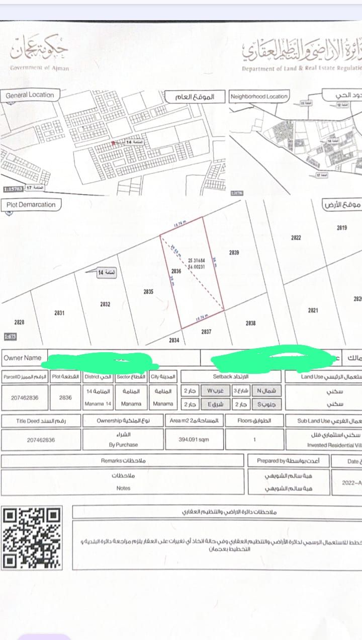 للبيع أرض في منطقة المنامة - عجمان الموقع المنامة حوض 14 المساحة 4240 قدم مربع موقع مميز للاستثمار أو السكن السعر 190000 درهم قابل للتفاوض