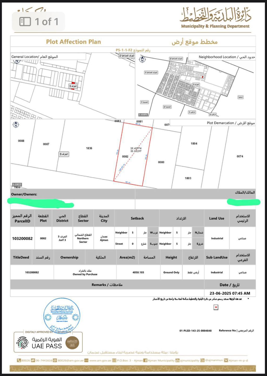 للبيع أرض في عجمان منطقة الجرف الصناعية 3 سعر القدم 245 درهم قابل لتفاوض المساحة 43595 ألف قدم مساحة بالمتر 4050 متر