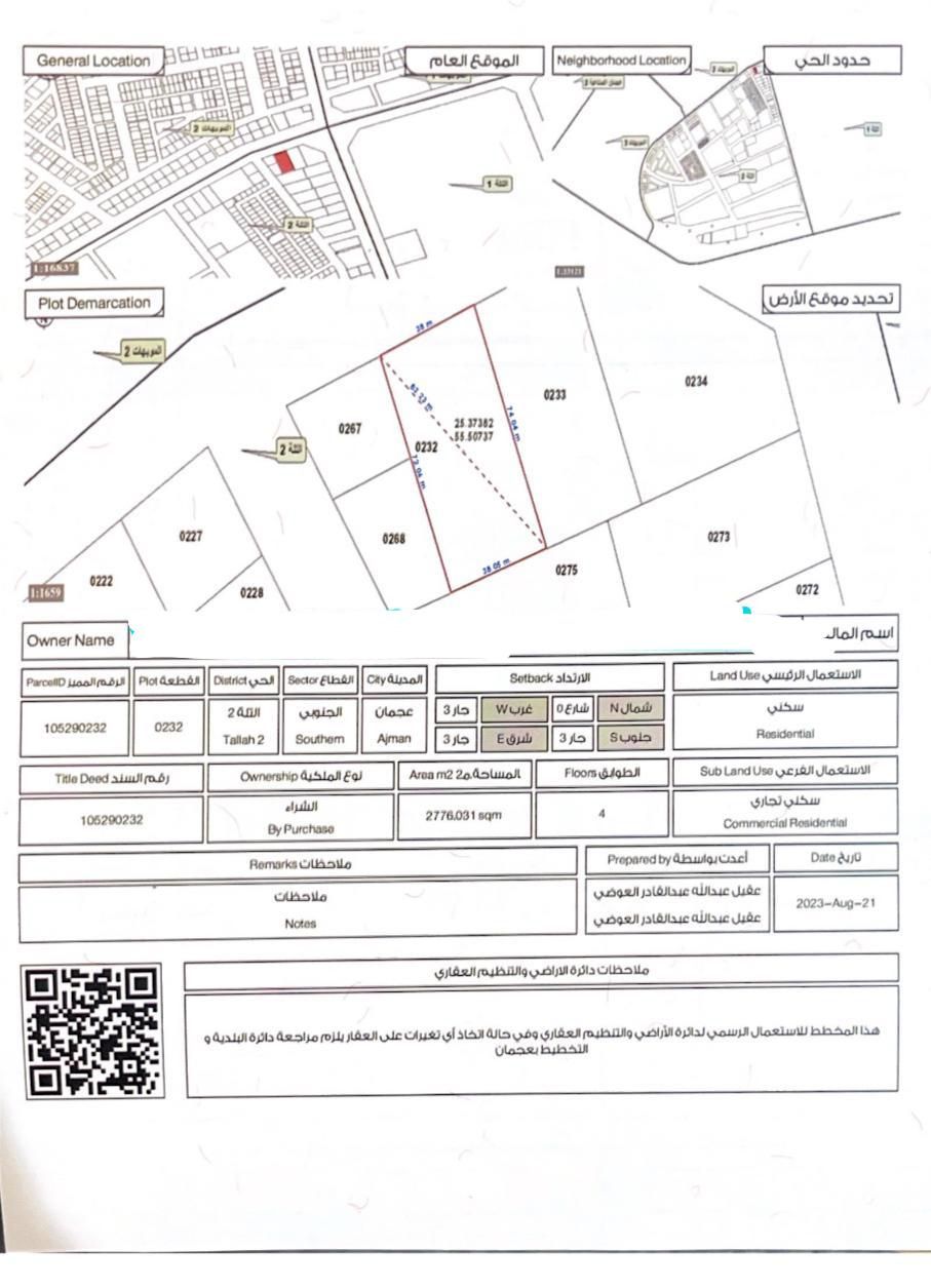 التلة 2 عجمان شارع الأكاديمية ثاني قطعة من شارع الشيخ عمار قطعة أرض سكني تجاري تصريح أرضي و4 طوابق (تملك حر) مساحة الأرض 2776م - 29880 قدم مطلوب 12500000 درهم
