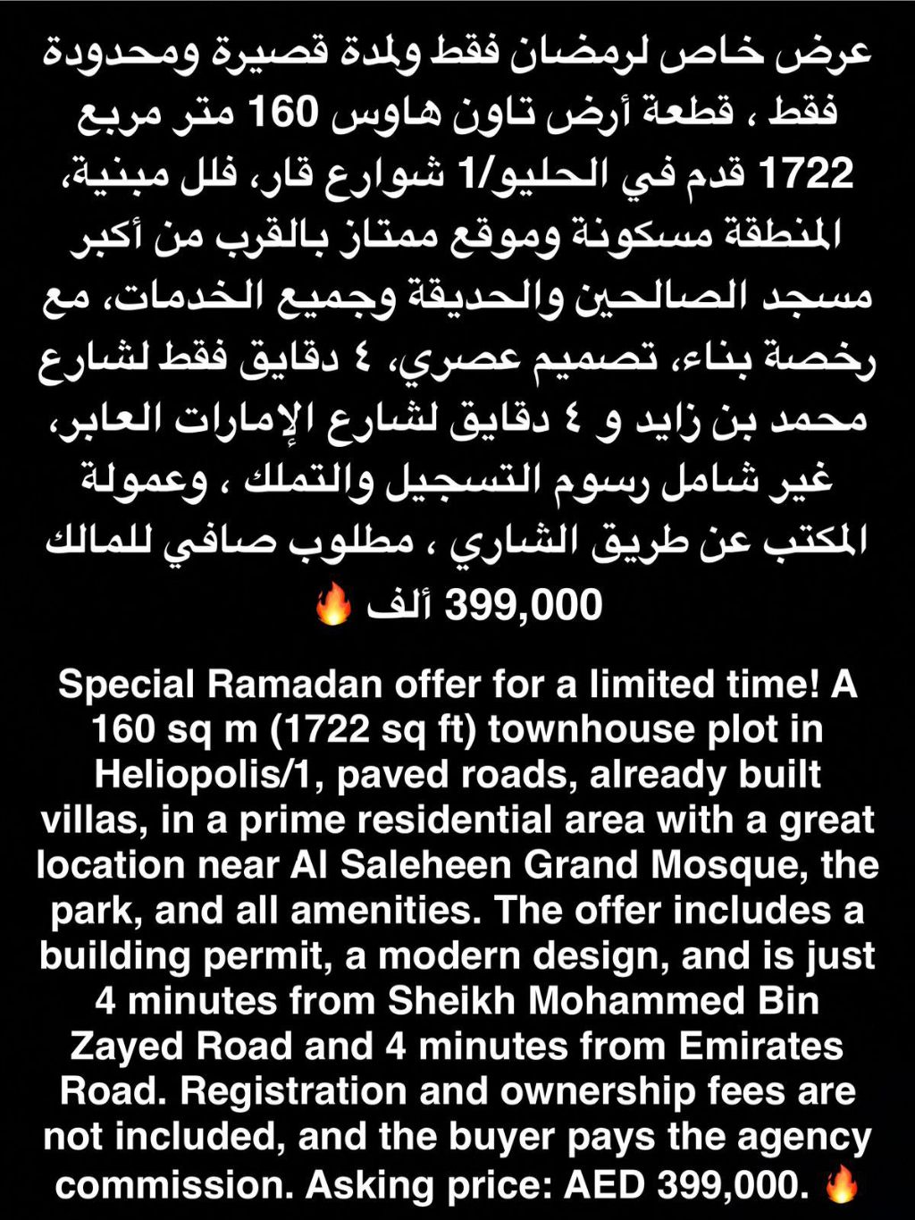 عرض الرمضان فقط أرض تاون عاوس 160 متر مربع / 1722 قدم في منطقة الحليو 1 شارع قار. فلل مجاورة منطقة سكنيه جدا قريبة من أكبر مسجد الصالحيم والجديقه وجميع الخدمات وفقط 5 دقائق لطريق مدينة محمد بن زايد ودقائق لشارع الامارات العابر السعر 399 ألف فقط غير شامل رسوم التسجيل والتملك والعمولة وتكون علي المشتري