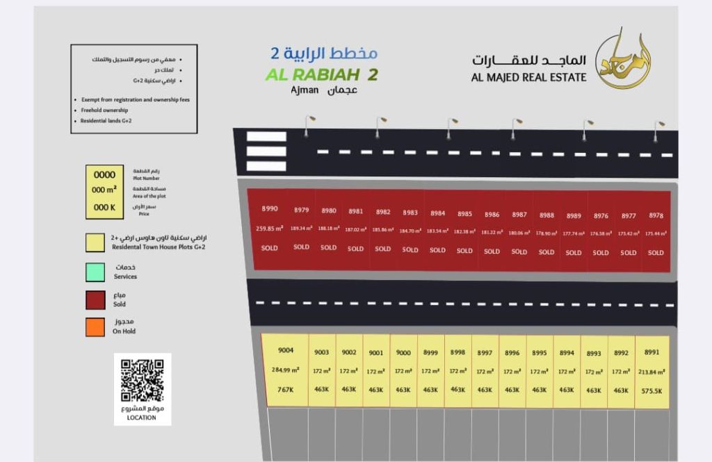 للبيع بمنطقة الحليو 2 عجمان عدد 14 قطعة أرض تاون هاوس مساحة كبيرة مساحة القطعة 172 متر 1852 قدم سعر القطعة 463 ألف درهم شامل رسوم التسجيل والتملك تملك حر لجميع الجنسيات دفعه أولي 30% والباقي علي دفعات شهريه لمدة 4 شهور بدون عمولات