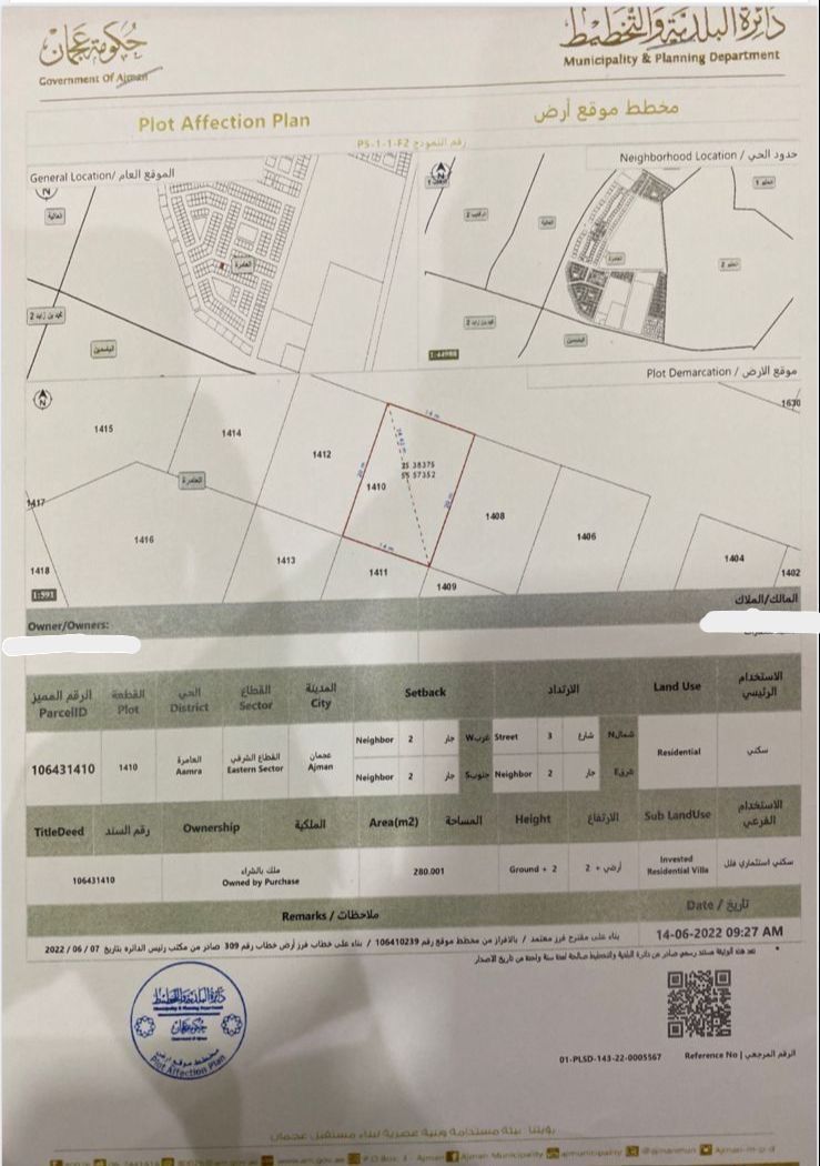 أرض للبيع في عجمان منطقة العمرة المساحة 3014 قدم مربع طابق أرضي + طابقين سكني السعر 790 شامل رسوم التسجيل مباشر لي تواصل