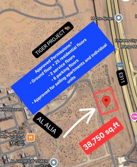 للبيع أرض سكنية تجارية مميزة في منطقة العالية - عجمان موقع استراتيجي بالقرب من شارع مدينة محمد بن زايد، ومجاورة لمشروع "تايجر والعالية جلوبال فرصة ذهبية للمستثمرين والمطورين المساحة 3600م 38750 قدم مساحة البناء المسموح بها 860000 قدم التصريح أرضي 25 طابق سكني - طابقان خدمات - 6 طوابق مواقف سيارات - تصريح بيع وحدات وشقق منفصلة