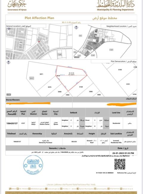 قطعة أرض للبيع - المنامة، عجمان (حوض 8) فرصة ممتازة لبناء فيلا سكنية في موقع مميز تفاصيل الأرض الموقع المنامة، عجمان - حوض 8 رقم القطعة 0191 الموقع ثاني قطعة من شارع رئيسي المساحة 474 متر مربع (5102 قدم مربع) الترخيص سكني خاص - أرضي + أول السعر المطلوب 230000 درهم للتواصل أحمد عبد الرحمن مكتب الابداع للعقارات