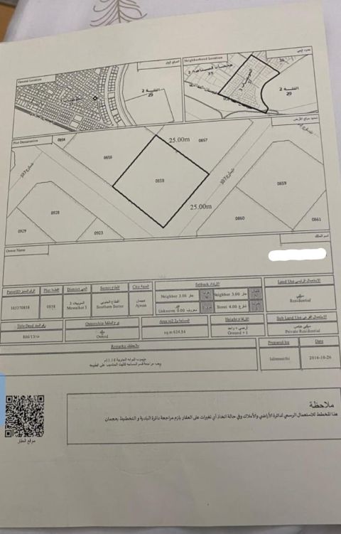 قطعة أرض للبيع في إمارة عجمان - المنامة - حوض 2 القطعة رقم 576 - الأرض علي شارعين الأرض علي مساحة 576 متر - 6200 قدم تصريح البناء سكني خاص أرضي وأول السعر المطلوب 255000 ألف درهم