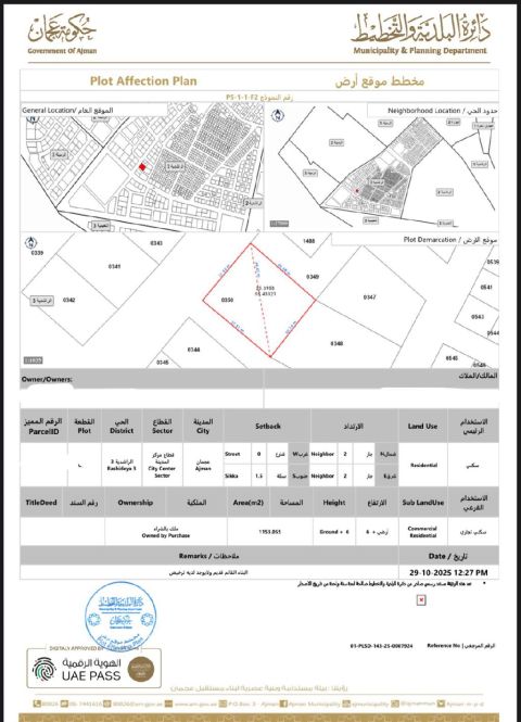 للبيع في الراشدية 3 في عجمان قطعة أرض سكني تجاري أرضي و6 شارع وسكة بجوار المسجد مباشرة على شارع قار - تملك حر مساحة الأرض 1153 متر - 12410 قدم