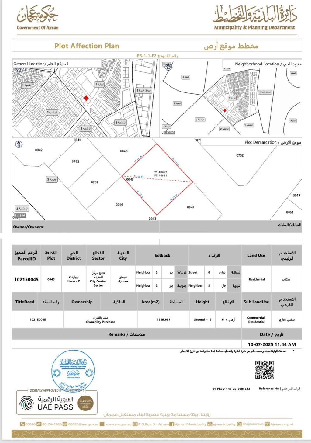 للبيع من المالك مباشر ليوارة 2 - عجمان سكني تجاري (أرضي + 6 طوابق) المساحة 1559م (16782 قدم) موقع ممتاز خلف بنك أبوظبي التجاري المطلوب 7300000 درهم فرصة استثمارية مميزة بموقع حيوي for sale - Direct from Owner Liwara 2، Ajman Residential + Commercial ( G 6 Floors) Area 1559 SQM (16782 SqFt) Excellent location behind Abu Dhabi Commercia
