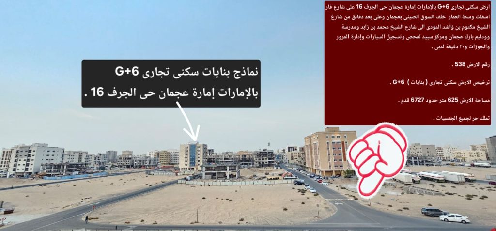 For only AED2300000 get a commercial land Ground plus 6 floors in Al Jerf Industerial artea 3 Commercial residential land G 6. IN UAE Ajman Al Jerf 16 on asphalt street. Directly behind china mall, Afew minutes to sheihk Maktoum bin Rashid road leading to sheihk Mohamed bin zaid road, woodiem park school Ajman, speed vehicle testing & registration, Ajman university, Ajman court, traffice and