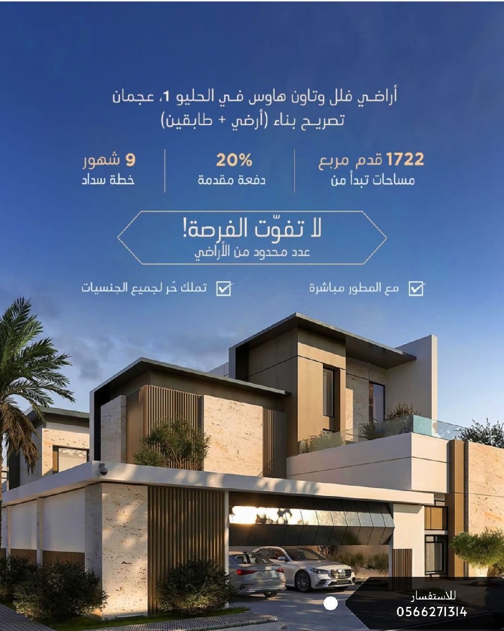 امتلك أرض بدفعة أولى وقسط الباقي على 9 شهور في أميز لوكيشن ب عجمان مساحة 1722 قدم ومساحة 3014 قدم