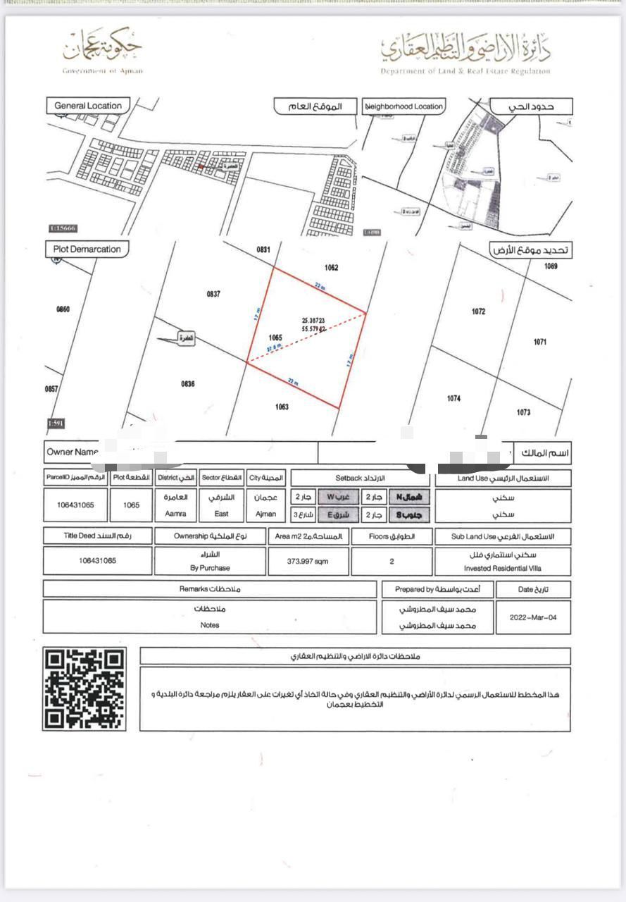 For sale, a residential plot of land for investment, villas, in Ajman, Al Amerah area, opposite Azha Complex, area 4024 feet, ground floor permit and 2, price 1000000 dirhams, freehold for all nationalities