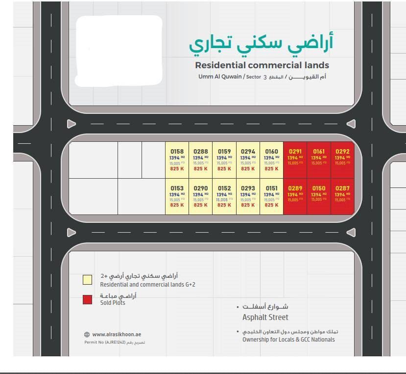 أراضي تجارية في منطقة المقطع 3، إمارة ام القيوين رخصة سكنية وتجارية G 2 مملوكة للمواطنين ومواطني دول الخليج تم تم هيد الشوارع مع امكانية الدفع على مدار 6 أشهر السعر لا يشمل رسوم التسجيل
